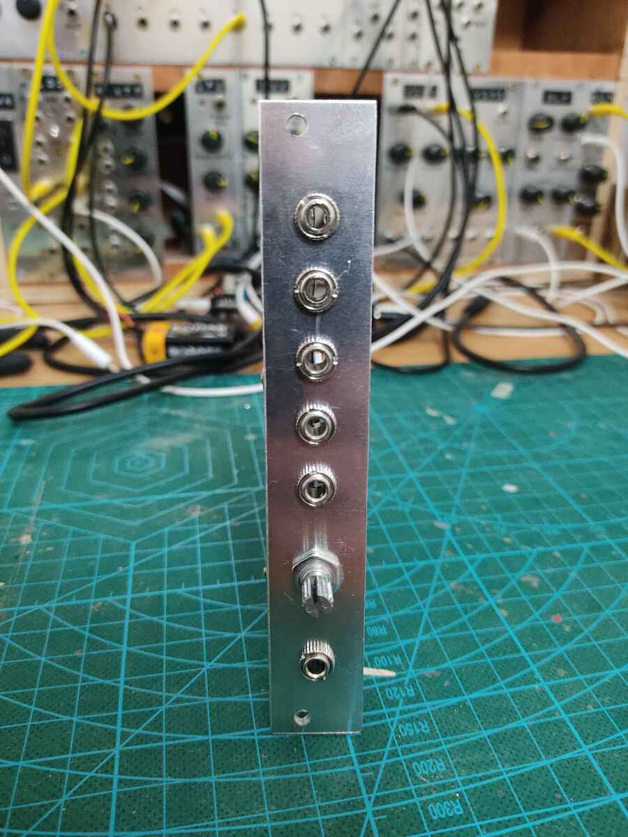 this is... pretty much identical to the grainy noise circuit from the mfos noise cornucopia linked above. i did tweak the values a bit to reduce the range of the graininess pot cos with the original values the transition between "grainy" and "full on torrential downpour" was way faster than it seemed like it should be? but other than that its basically identical so there's not much to say on it other than that the pot is doing a very good job holding the circuit bracket in place ;3